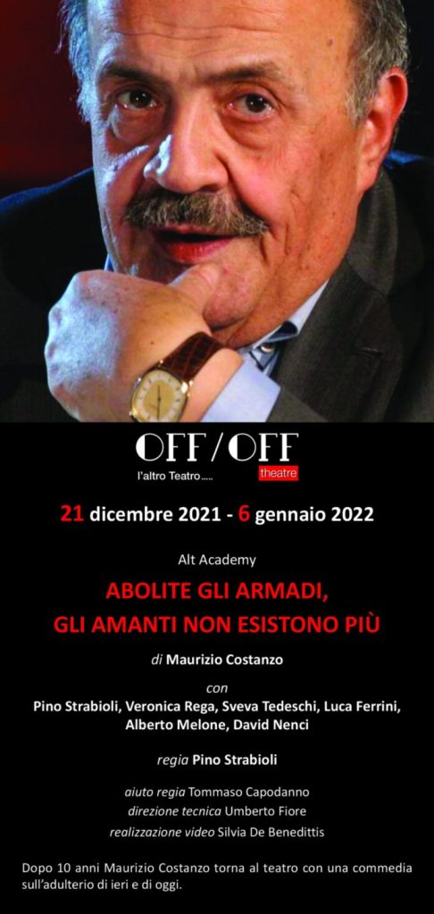 Ma davvero abbiamo abolito gli armadi, come sembrerebbe suggerirci provocatoriamente il testo di Maurizio Costanzo? O hanno solo cambiato design, sostituendo gli sportelli in legno con vetri più o meno oscurati? Nel corso dello spettacolo è questa la domanda che ci viene suggerita. Soprattutto scenograficamente. Si parte allora dall’art. 559 del Codice Civile (che prevedeva la pena di reclusione per gli amanti, in diversa misura se uomo o donna) per passare alla metafora delle “corna” come simbolo di fertilità e di buon auspicio. Fino ad affrontare il Nono Comandamento e l’affermazione del Vangelo di Matteo: “chi guarda, ha già commesso adulterio”. E poi ,ancora, passando per il Decamerone di Boccaccio, il Barbiere di Siviglia, l’era fascista, le lettere censurate di Matilde Serao e ancora altro. Il tutto punteggiato da brani di Jannacci, Camerini e De Andrè. “La fedeltà in fondo che cos’è? Non è altro che un grosso prurito con il divieto assoluto di grattarsi’.