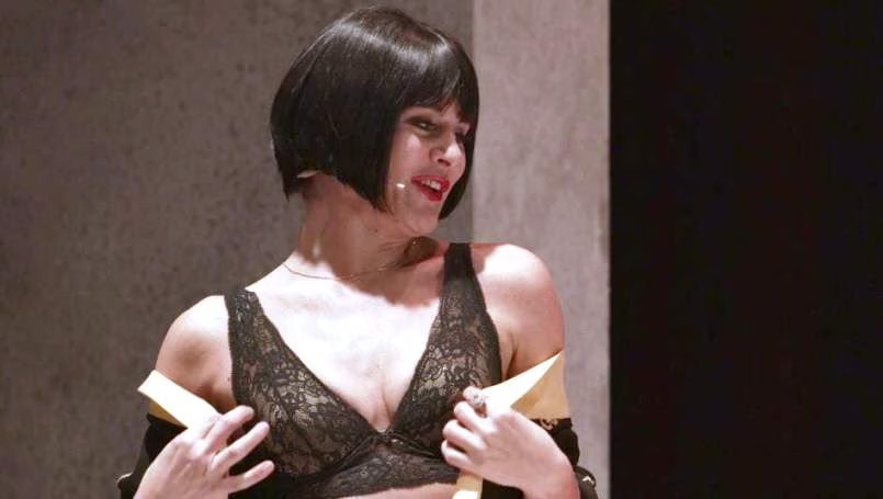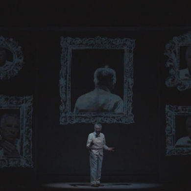 Il soffio nostalgico e vagabondo di un motivo alla fisarmonica anticipa l’apertura del sipario: preludio all’amara analisi pirandelliana sul soffio vitale umano. Ci si rivela poi una scena marmorea, grigia: il colore della tristezza, della compresenza di bene e di male. Ci arriva la sensazione di un ambiente che sa un po’ di tribunale, un po’ di obitorio e un po’ di giudizio universale: luoghi nei quali si crede di poter stabilire l’esatta identità delle persone.