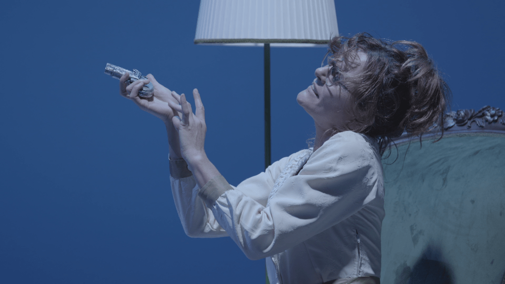 La scena è abitata da un uomo, seduto di spalle, rivestito di una camicia bianca (che rimanda al Rinascimento e insieme ad un ospizio-manicomio) e da un giudice in doppiopetto scuro, in piedi su di un piccolo podio. Qualcosa di verde spicca: è una coperta, che l’uomo in bianco, nel voltarsi, notiamo tenere sopra le proprie gambe. Colore dominante nel mondo naturale, il verde ci circonda ed è il segno di via libera per procedere e andare avanti (non a caso, l’occhio umano ha il picco di massima sensibilità proprio per le frequenze relative alla luce verde).