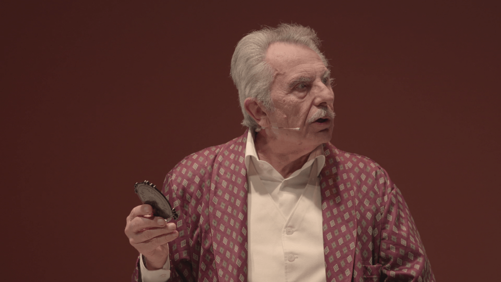 E questo scopriremo dal momento in cui le grigie pareti marmoree, scorrendo, ci introdurranno prima nell’atelier rosso dannunziano della moglie di Vitaliano Mortara (una sensuale ed ammaliante Marianella Bargilli, quasi una Valentina di Crepax); poi lungo le vie della città dove Mortara cercherà e troverà uomini simili a lui, composti ma in realtà scomponibilissimi. E ancora, a seguire saremo portati nell’ufficio dell’apparentemente compostissima azienda di famiglia, sulla scrivania della quale troneggia però un mezzo busto dell’insospettatamente scomposto Giulio Cesare.