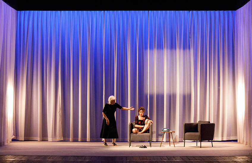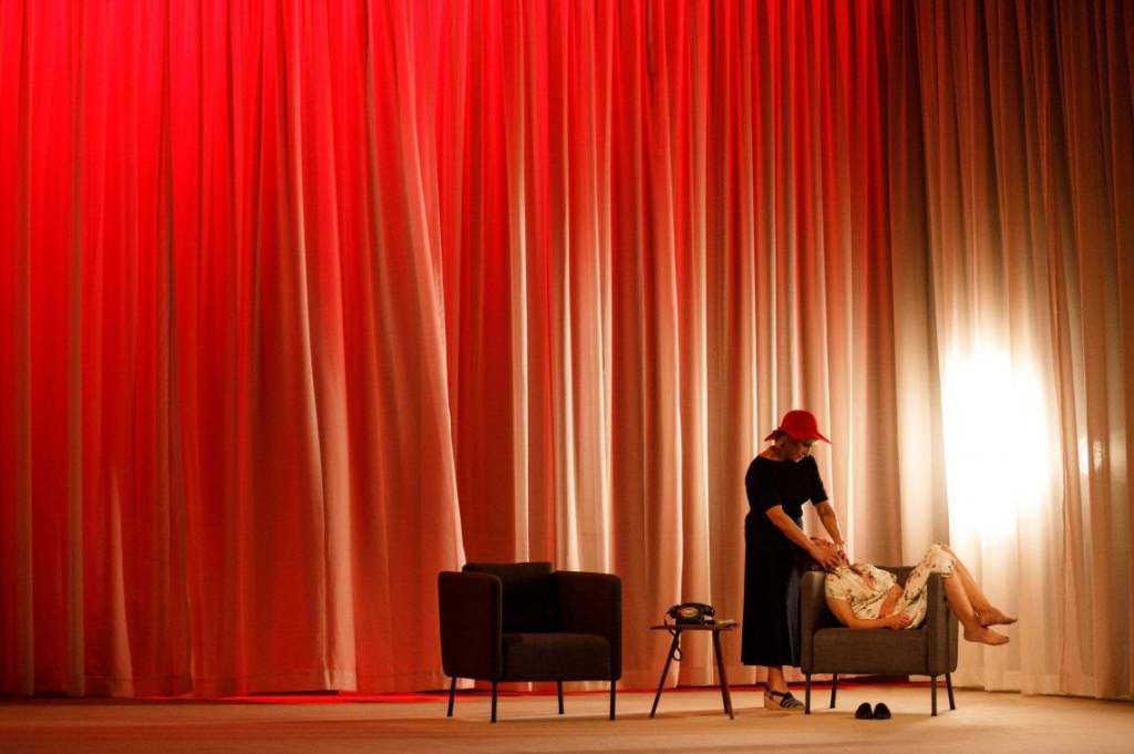Non a caso il regista De Angelis per dar vita a questo perimetro nebbioso sceglie di posizionare quasi tutti i proiettori del disegno luci dietro il fitto panneggio di tende che ricoprono le pareti della scena. Perché è la luce che crea lo spazio e questo vuole essere uno spazio  disperatamente paludoso, subdolamente rassicurante, senza identità, senza appartenenza. Spazio che il regista lascia (apparentemente) vuoto solo perché troppo pieno di passato, di ricordi, di rimpianti, di rimorsi. Accatastati l’uno sull’altro.