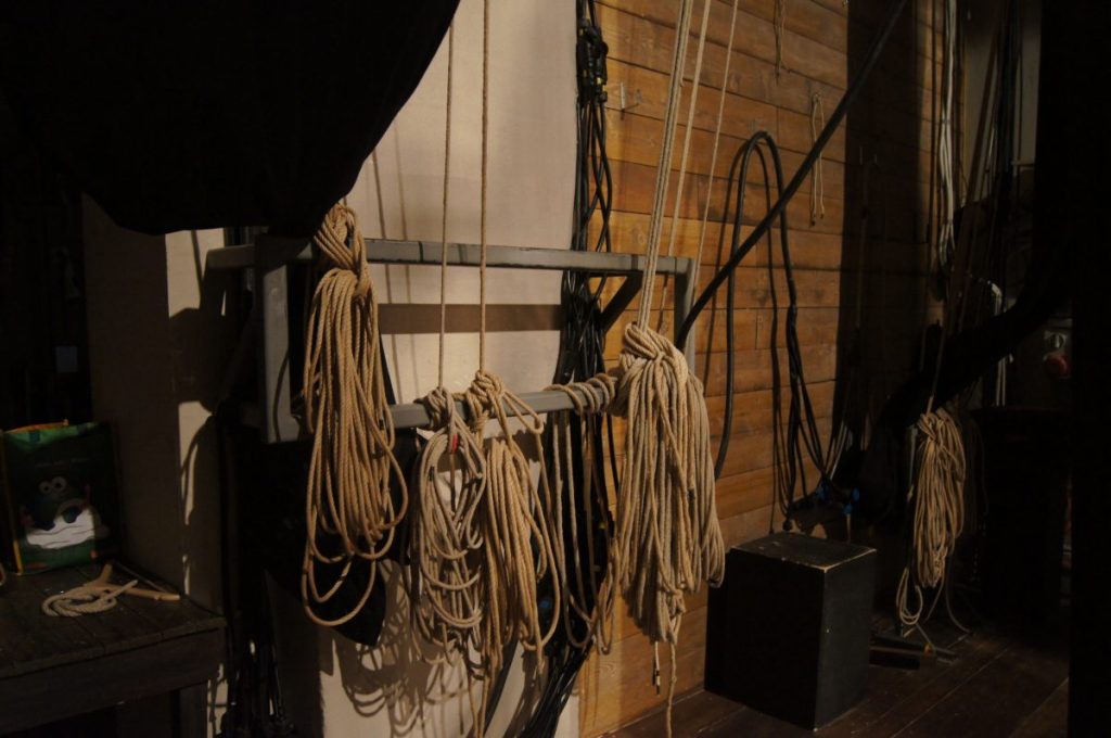 Attraversando le mura perimetrali del palcoscenico: quelle dove vengono ancorate le strutture del mantegno, sulle quali sono annodate le corde che provengono dalla graticcia e sostengono gli elementi scenici sospesi.