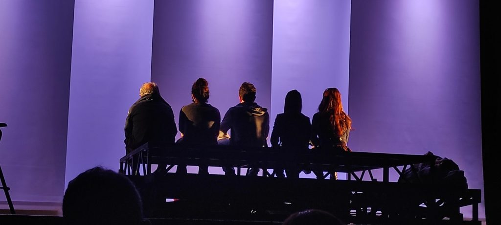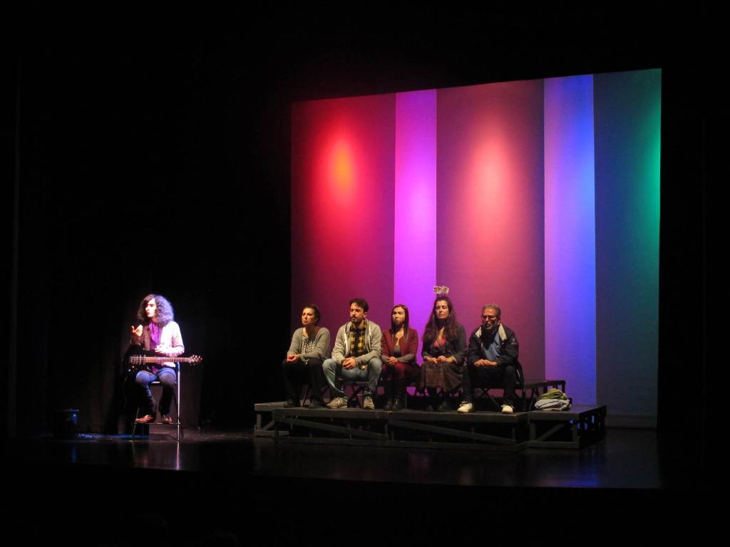 Un praticabile ospita gli attori: sempre tutti in scena, “inquadrati” di volta in volta grazie a scelte tecniche semplici ma molto efficaci. All’inizio della narrazione tutti i personaggi vengono presentati, e quindi “definiti”, da un altro personaggio: forse perché è attraverso lo sguardo dell’altro che esistiamo.