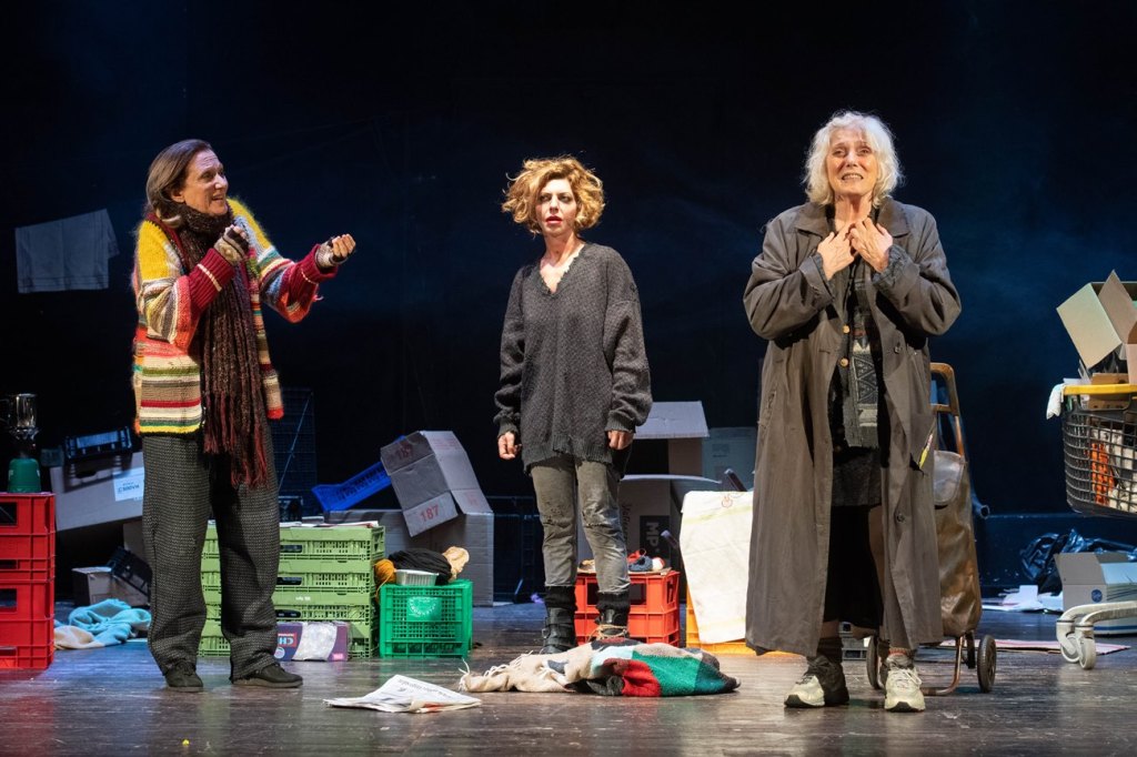 Marina Pizzi, l’autrice, scrive un testo davvero fascinoso: dapprima ti sequestra l’attenzione trascinandoti in una realtà surreale, quasi da teatro dell’assurdo. Tanto che le due barbone in scena, Regina e Tonta, ricordano quella tensione di “ansia, freddo buio e vuoto” anche di Vladimiro ed Estragone (“Aspettando Godot” di S. Beckett).