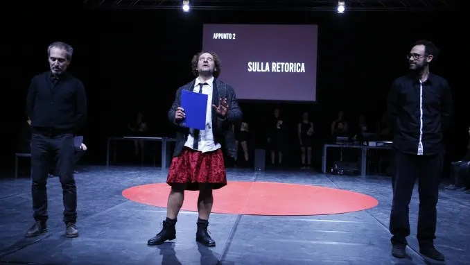 La docu-performance si articola grazie alla sinergia con un coro di cittadine e cittadini – Vera Borghini, Tina Cannavacciuolo, Luciano Ciamillo, Daniele Di Lazzaro, Daniela Iannola, Francesco Lepore, Giuseppe Prestano, Pasquale Rispoli, Claudio Sacchi, Antonia Stazi – intorno ad un interessante sguardo dialogante tra dentro e fuori, tra prima e dopo, tra (il credere) essere attori e l’essere spettatori di una stessa realtà. La narrazione prende avvio “dai moti rivoluzionari degli anni ’90 del Novecento”, dove ci siamo fatti persuadere dall’ambigua capacità retorica di alcuni “dei” della scena politica e sociale. Maschere che nel cerchio magico al centro della scena vengono “smascherate”, decodificate, nella loro ambiguità prossemica e posturale.