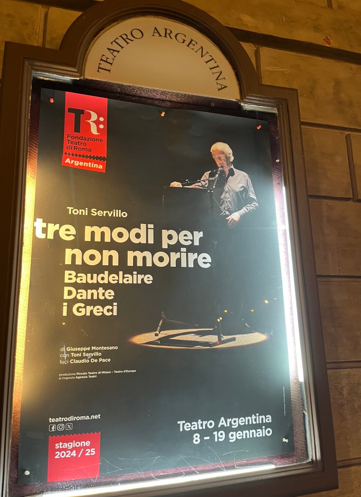 Quella di Toni Servillo si rivela un’interpretazione fiammeggiante, capace di appiccare fertile fuoco creativo sullo spettatore. Così come la sinergia di testi che dà forma a questo adattamento sortisce l’effetto provocatorio e insieme balsamico di un attuale “conosci te stesso”. Un accorato invito, quello dell’autore Giuseppe Montesano, a non smettere di interrogarci su chi davvero siamo, specchiandoci nel confronto con le vite altrui – qui, quelle di Charles Baudelaire, di Dante Alighieri e dei Greci – così da trovare una risposta, “un riflesso di conoscenza, un invito al coraggio”. E giungere, con partecipazione commossa, a riscoprirci “uomini”. Capaci, se insieme, di fare della nostra mostruosa finitudine una ricchezza in continua trasformazione.