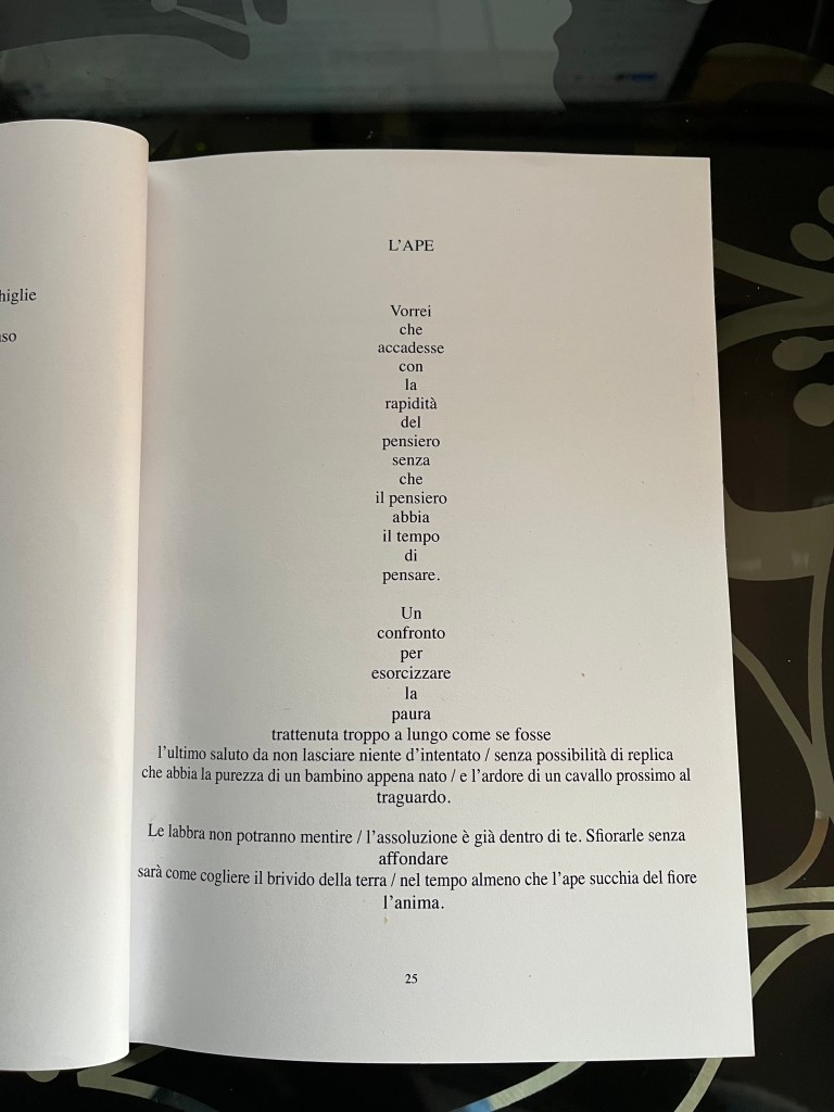 Perché l’amore é quel qualcosa che non si puó dire, che é ambiguo anche quando sembra ovvio; che va assaporato e rintracciato mentre si dicono altre parole. Oppure va dedotto dal gioco della prossemica: “… ma quanto amore c’era/in quelle mie parole/anche quando prendevo la distanza/per esserti vicina…”