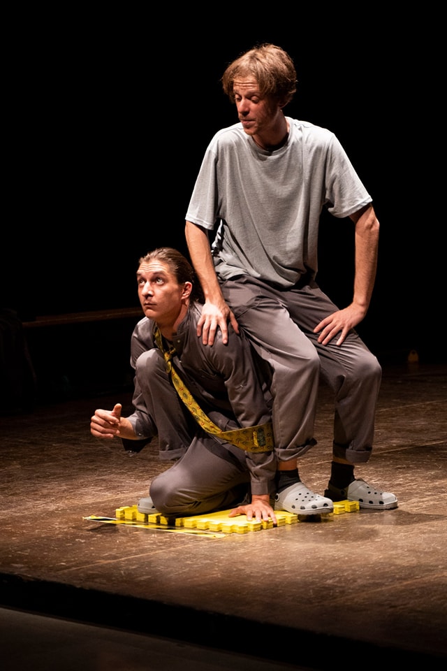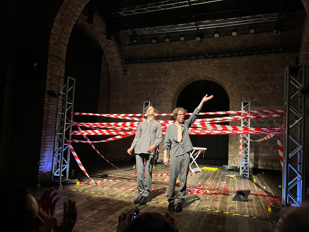 Uno spettacolo che fin dall’inizio prende d’assalto lo spettatore facendo emergere un’angoscia che, in un crescendo incalzante, arriva a riaccendere il sapore di un trauma. E lo senti anche in gola: come il nodo di quella cravatta che i due interpreti indossano e che sembra diventare sempre più opprimente. Quasi un cappio.