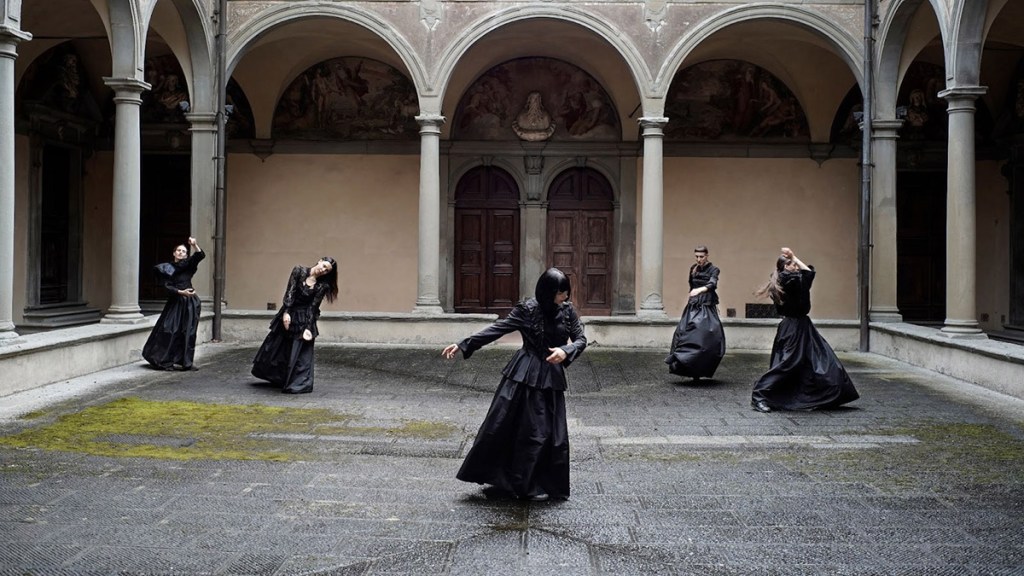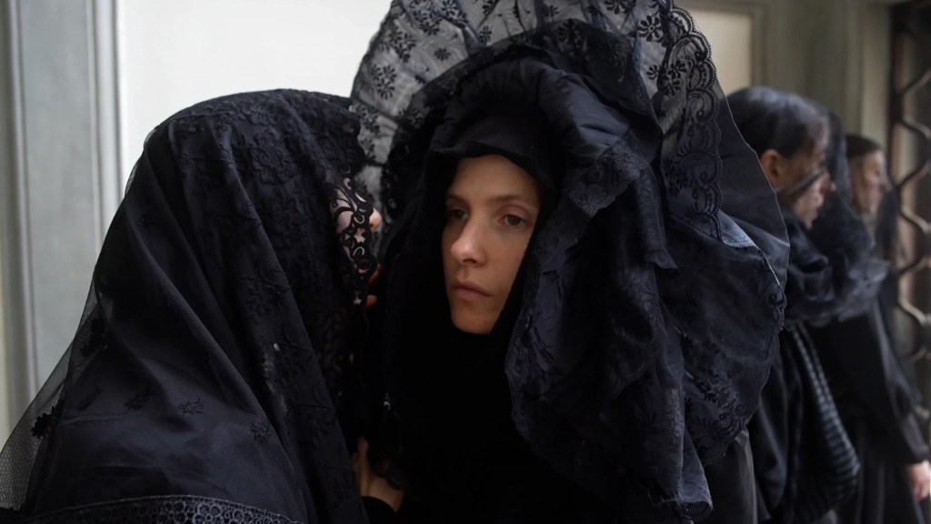 E poi una di loro crolla: le altre la spogliano liberandola da quello che resta del suo vecchio habitus (modo di essere, di stare). E, nel sorreggerla, danno vita ad un tableau vivant: la deposizione di Cristo dalla croce.