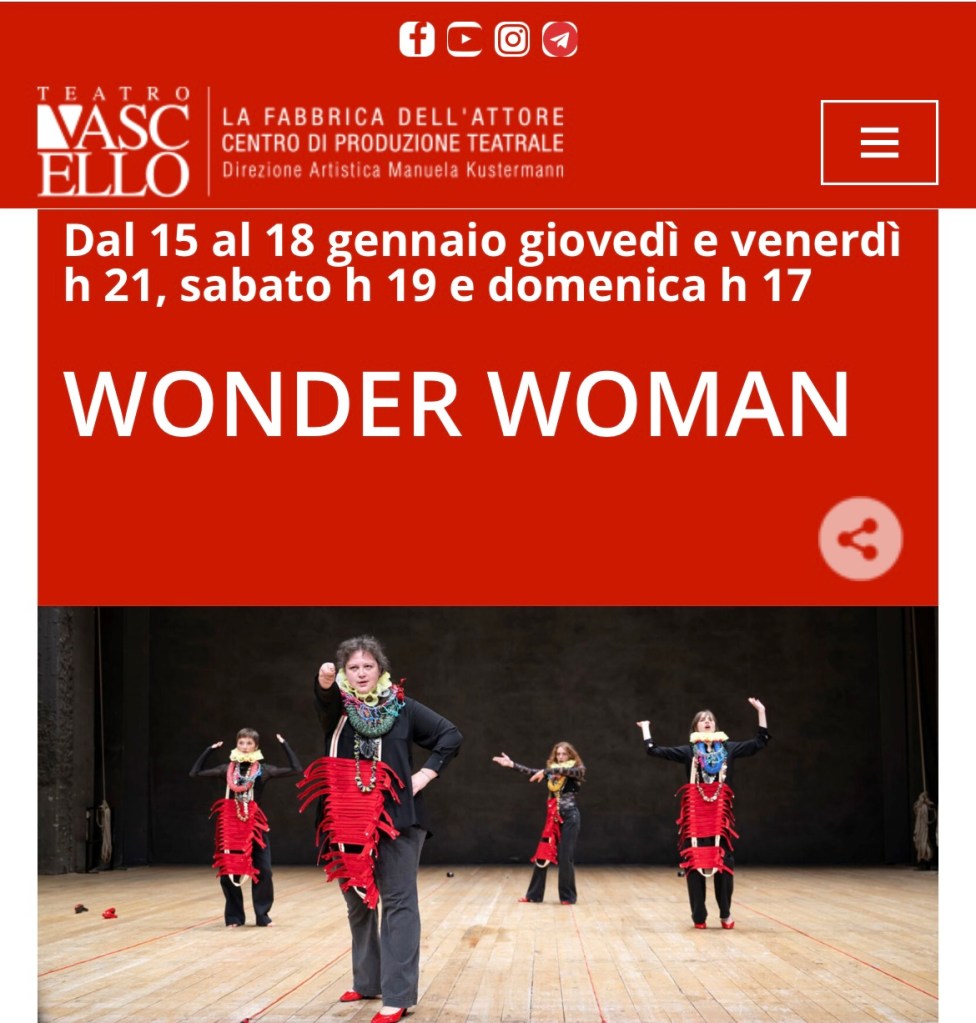 L’iconica super eroina creata da William Moulton Marston e scelta da Antonio Latella e Federico Bellini per riflettere e parlare della necessità che abbiamo oggi di super eroi. Lo spettacolo Wonder Woman fa parte infatti di una trilogia – insieme a Zorro e a I tre moschettieri – che s’interroga su che cosa significhi oggi essere dei super eroi .