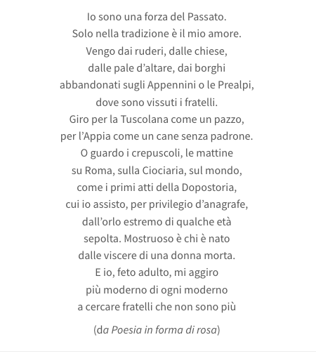 Una preghiera che invita a guardare la realtà con la capacità di indignarsi e di commuoversi, alla quale Boccaccini allaccia la poesia “ Io sono una forza del Passato”: dove il Poeta si descrive come un “feto adulto” che, consapevole del proprio radicamento storico, cerca disperatamente i resti di un passato contadino e sacro nel presente consumista.