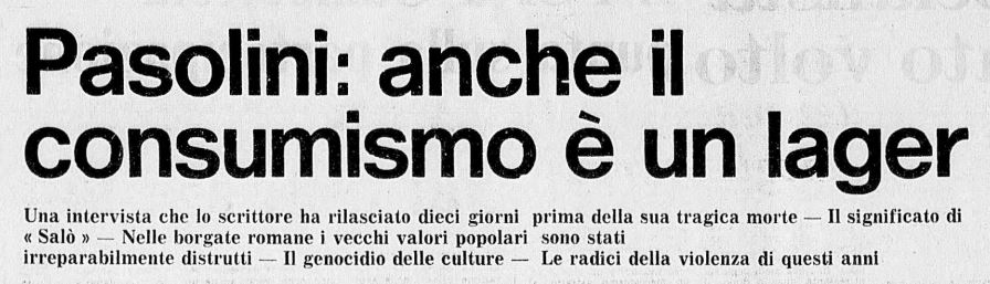 Ma poi in questa parte destruens, si inserisce lo sguardo dei soldati che liberarono i lager (in Pasolini metafora del consumismo, in quanto nuova forma di annientamento del “diverso”) come portatori di uno sguardo puro su un orrore indicibile. E l’accorata preghiera di Pasolini: “Vi prego, siate come quei soldati, i più giovani di quei soldati, che sono entrati per primi oltre i reticolati di un lager… E lì i loro occhi… Ah, vi prego, siate giovani come loro!”.