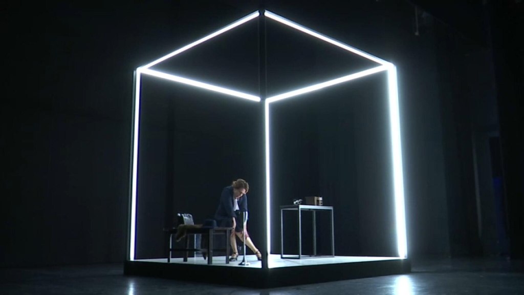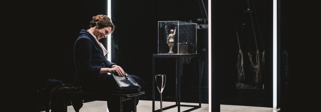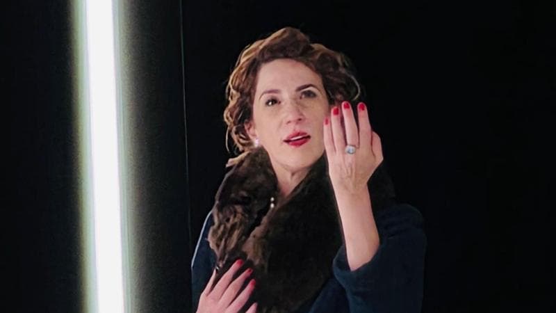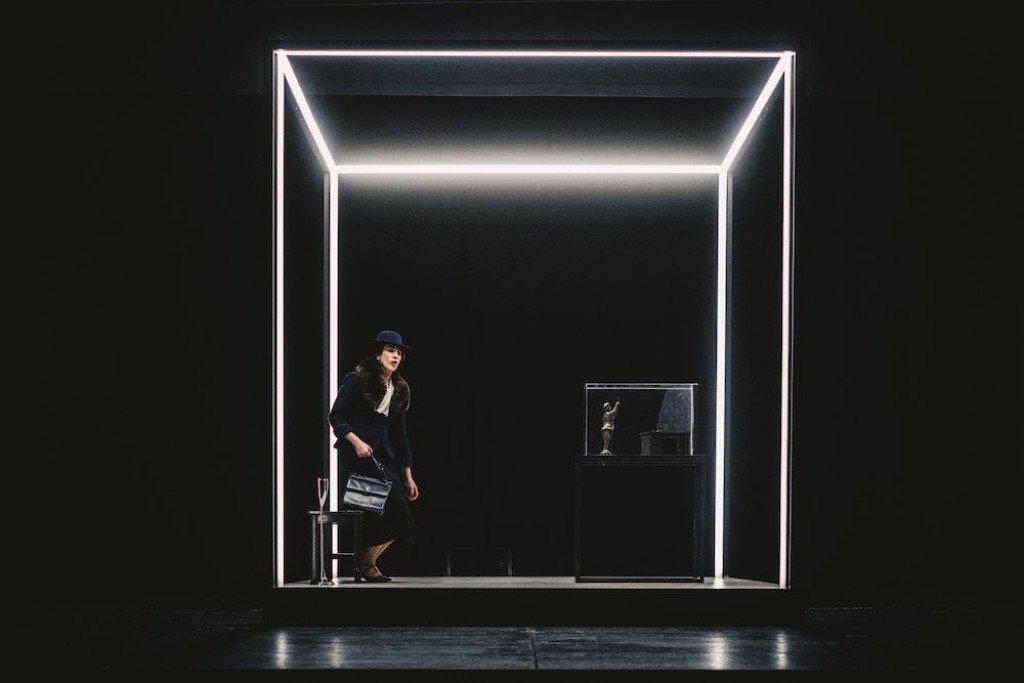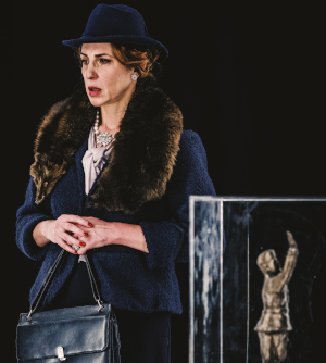 Lei (in scena una sconvolgente e ammaliante Claudia Coli) è una donna molto elegante, fasciata nel suo tailleur  blu notte: capo d’abbigliamento nato proprio nei primi anni del ‘900,  “manifesto” sartoriale che racconta con eleganza, potere e modernità la storia della liberazione femminile. Al collo una splendida coda di volpe: un accessorio “statement”, che coniuga l’ostentazione della ricchezza con la nuova, audace indipendenza femminile.