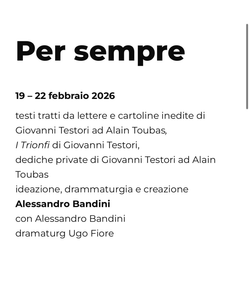 Da qui, da queste parole – “Cher Alain, je suis désespéré” – Alessandro Baldini sceglie di dare avvio alla sua drammaturgia, dedicata prevalentemente all’esplorazione del carteggio inedito delle oltre duemila lettere intercorse tra Giovanni Testori (scrittore, drammaturgo, pittore, critico d’arte, poeta, regista, attore: uno dei più importanti intellettuali italiani del Novecento) e Alain Toubas (gallerista d’arte), nel periodo che va dal 1959 al 1962.