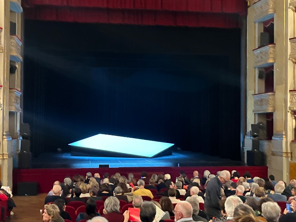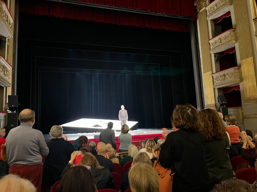 Massini, sceglie di entrare in scena dal fondo della platea: è uno di noi. E raggiunge la scena progressivamente: per testimoniare il suo sentire vicino al nostro.