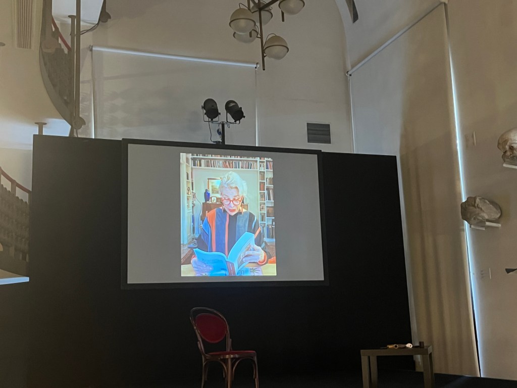 L’entrata sul palco di Giuseppe Manfridi è stata anticipata da un collegamento video con la celebre attrice Pamela Villoresi, la quale ha amato ricordare il piacere con il quale non solo ha letto ma si è lasciata leggere da quest’ultimo libro di Manfridi “Shakespeare sul Titanic”, prima ancora che il libro andasse in stampa. E come, nel sentirsi profondamente coinvolta nella lettura, abbia desiderato condividere con Manfridi un breve e appassionato racconto su una sua esperienza di fertile naufragio umano e professionale. Racconto che Manfridi ha così apprezzato, da scegliere di inserirlo all’interno del suo “Shakespeare sul Titanic”.