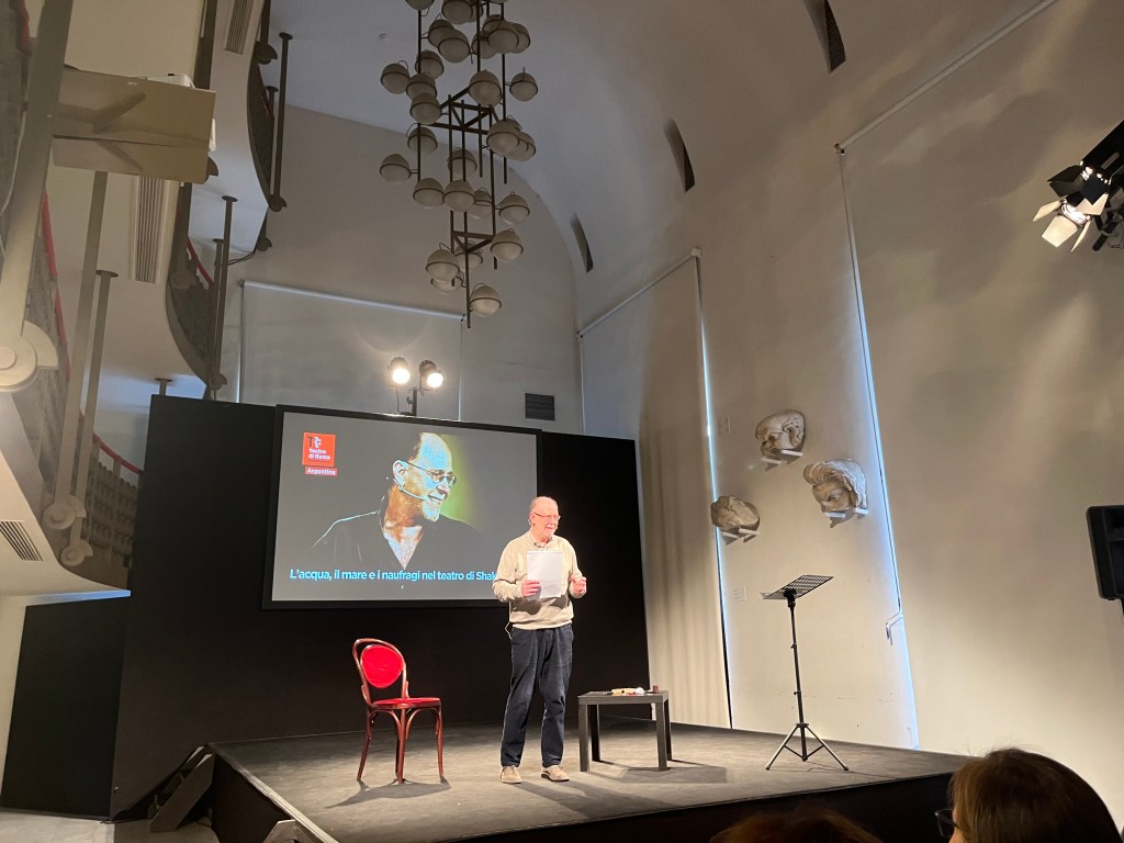 In un insolitamente gelido pomeriggio del marzo romano, la Sala Squarzina del Teatro Argentina ha accolto la prorompente affluenza degli spettatori che hanno scelto di partecipare alla conferenza spettacolo di e con Giuseppe Manfridi, dal titolo “L’acqua, il mare e i naufragi nel Teatro di Shakespeare”.