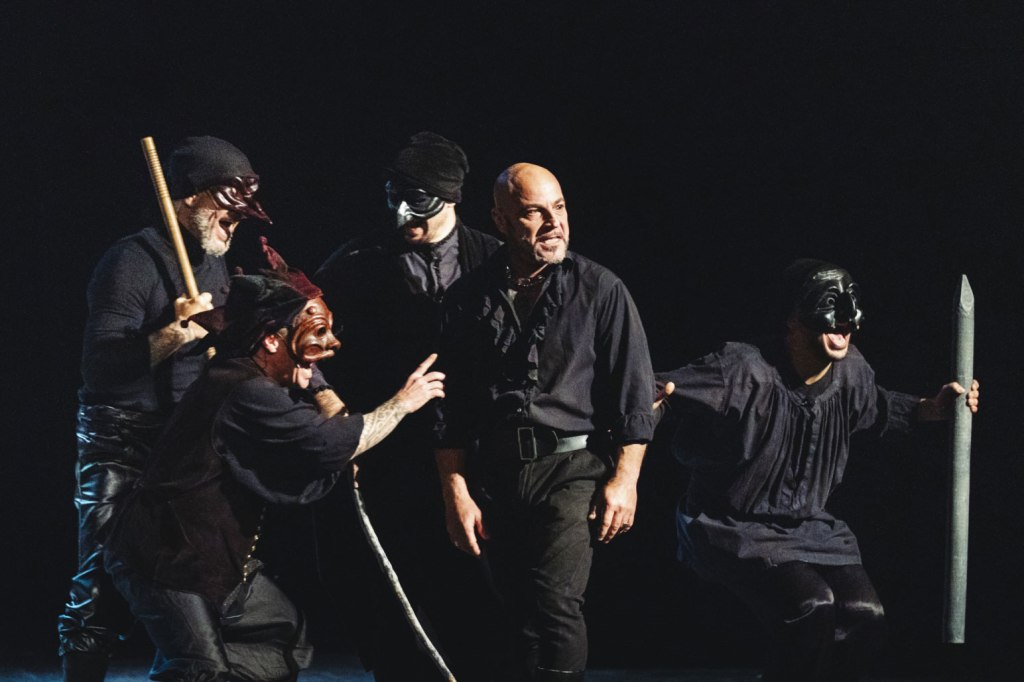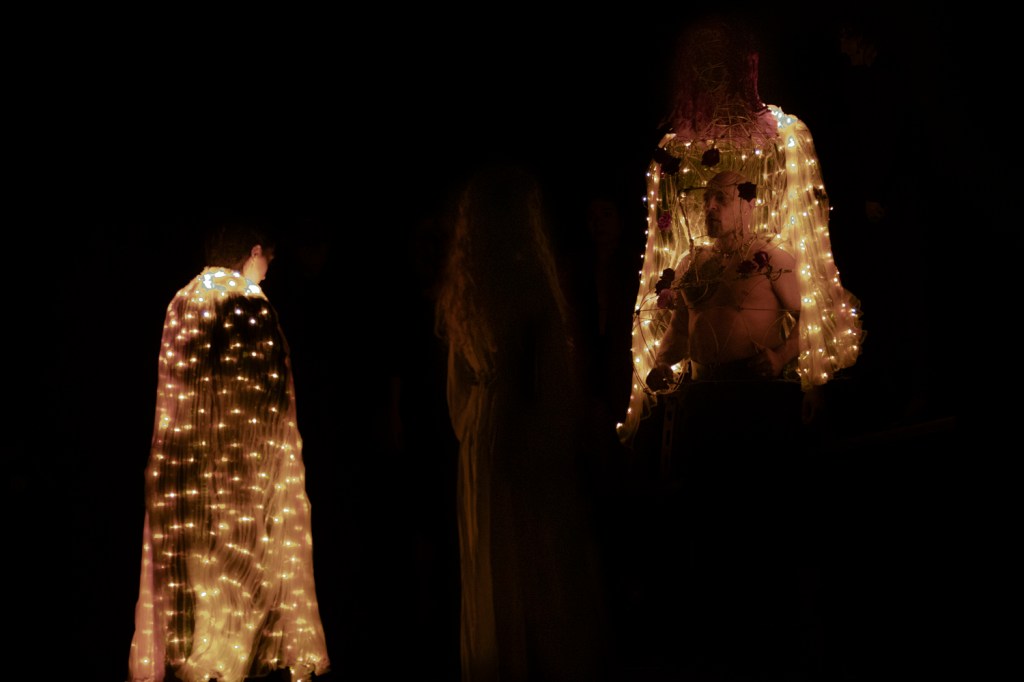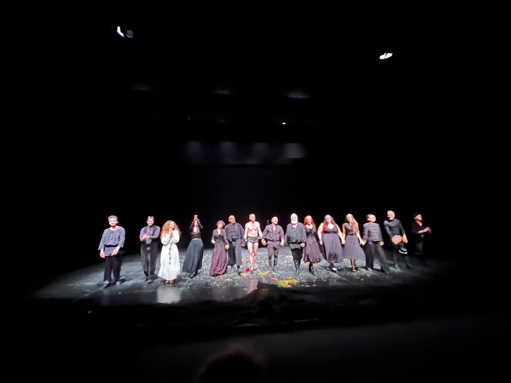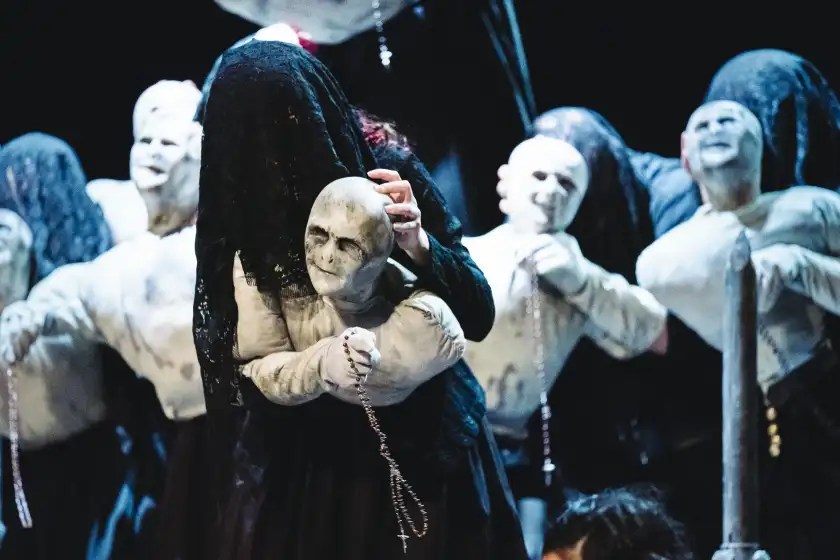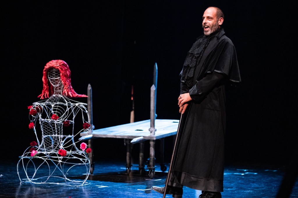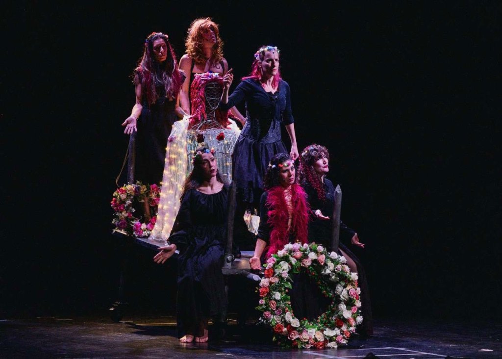 E poi c’è un altro quadro scenico dalla bellezza dilaniante: un flashback sul coro delle donne del paese che partecipano con devozione al funerale di Rosa. Ma che commentano sostenendo che se Rosa “avesse chinato la testa, sarebbe ancora viva”. E visivamente, in scena, emerge dalle loro nere vesti un cieco maschile che prorompe, genialmente, attraverso puppet.