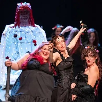 La feroce bellezza della regia di Valentina Esposito restituisce quadri scenici che si fissano negli occhi dello spettatore. Come il sacrale e sacrilego quadro dove delle donne – in splendida cornice attorno alla Pupazza Rosa – si offrono remissive e disponibili, “sempre pronte a dire sì”. E “accucciate” in attesa di essere travolte dalla tracotanza maschile e da quel che resta della perversione di un rito. Sono tutte (solo) esteticamente diverse: “la giovincella che si deve ancora aprire”, “la monumentale”, “la ciuccia”. ecc.