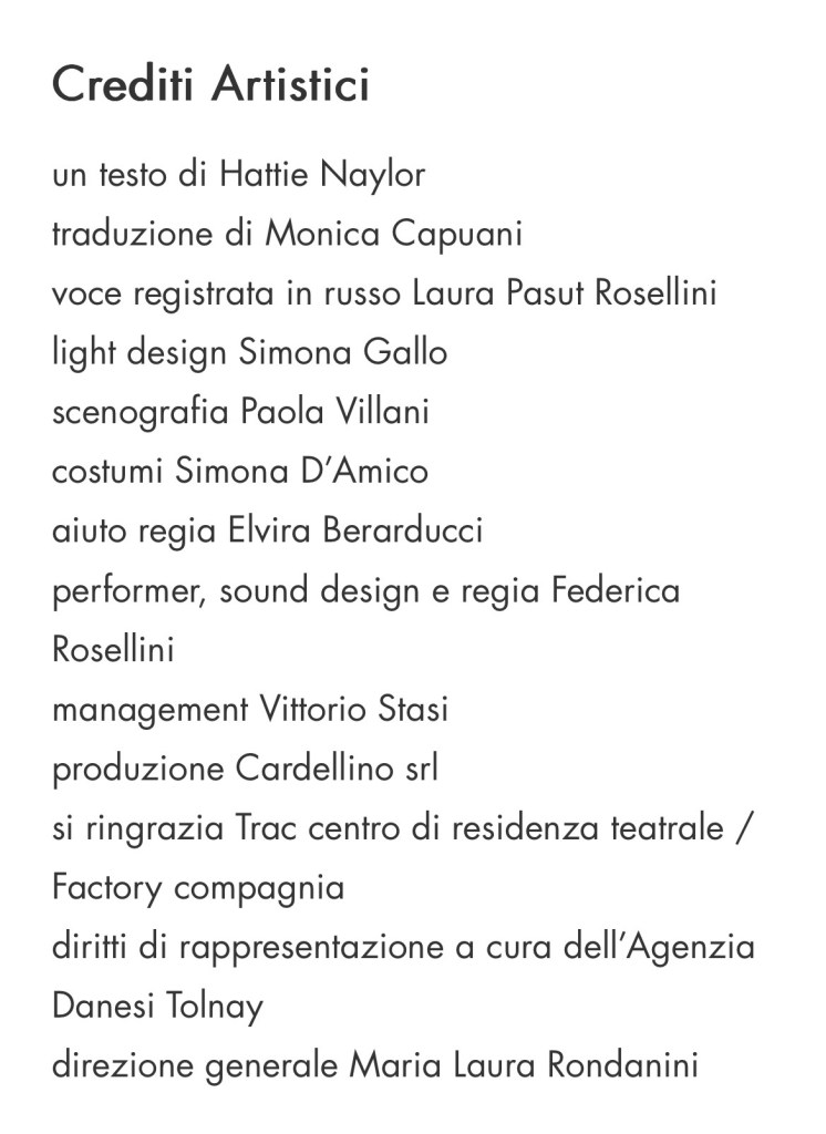 E commuove e sconvolge partecipare di come Federica Rosellini si lasci attraversare da ogni emozione – la delusione, il lamento, la rabbia parossistica, la meraviglia creativa di un amicizia autentica – rivelando un’espressività magnificamente infantile ed istintuale.
