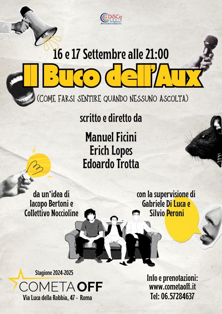 Dal 16 al 17 settembre 2025 debutta a Roma, al teatro Cometa Off, Il buco dell’Aux, spettacolo teatrale scritto da Edoardo Trotta, Manuel Ficini ed Erich Lopes, da un’idea di Iacopo Bertoni. Il progetto si avvale della consulenza drammaturgica di Gabriele Di Luca, autore, regista e interprete tra i più riconoscibili della scena nazionale contemporanea — fondatore della compagnia Carrozzeria Orfeo — e della consulenza registica di Silvio Peroni, figura di rilievo del teatro italiano, con produzioni ospitate nei più importanti teatri e festival nazionali.