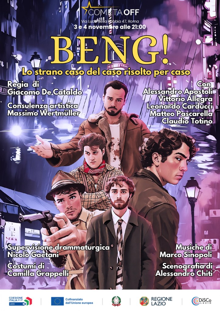 BENG! segna il debutto ufficiale del collettivo teatrale composto da Leonardo Carducci, Alessandro Apostoli, VittorioAllegra, Claudio Totino, Matteo Pascarella e Giacomo De Cataldo. I sei si sono incontrati all’interno del percorso formativo di Officina delle Arti Pier Paolo Pasolini, dove, sotto la guida di maestri e professionisti del settore, hanno condiviso visioni, esperienze e linguaggi comuni.