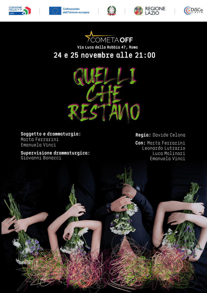 È da questa domanda che prende corpo QUELLI CHE RESTANO, il nuovo progetto teatrale firmato daMarta Ferrarini ed Emanuela Vinci, uno spettacolo che indaga il lutto, il branco, le famiglie e le assenze. Lo spettacolo, con la regia di Davide Celona, vede in scena Marta Ferrarini, Leonardo Lutrario, Luca Molinari ed Emanuela Vinci. La supervisione drammaturgica è di Giovanni Bonacci.Lo spettacolo sarà in scena al Teatro Cometa il 24 e 25 novembre 2025.