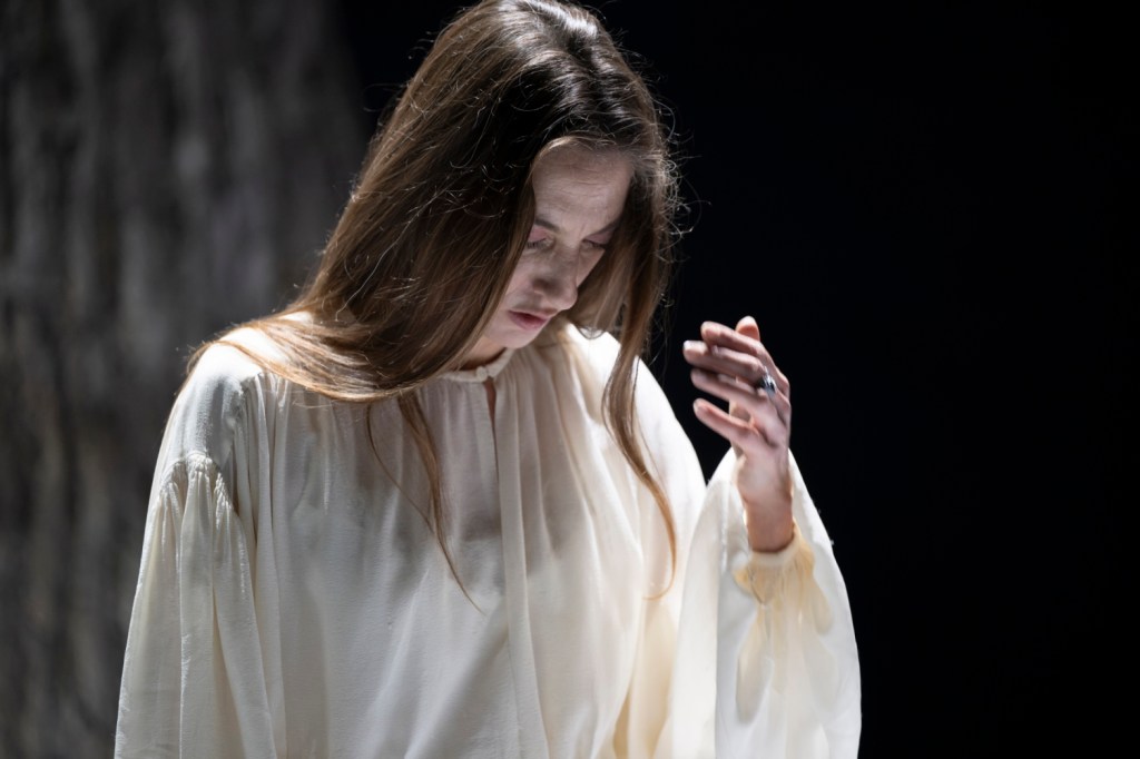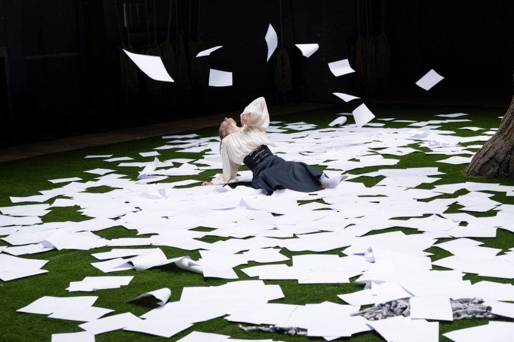 “Immaginare uno spazio scenico che accogliesse le parole scritte da Virginia Woolf per Orlando, è stata una sfida per nulla semplice. Un testo che, tra le altre cose, racconta proprio la difficoltà della parola di descrivere la natura, la bellezza. Alla fine, tutto confluiva qui, nella ricerca di un connubio, di un punto d’incontro tra natura e letteratura, tra la bellezza di un albero e il fallimento di qualsiasi forma d’arte che provi a raccontare questa bellezza. E quindi un tronco di quercia in mezzo ad un prato quadrato, un albero la cui chioma è fatta da luci, tralicci, americane: una fetta di realtà trasportata in uno spazio teatrale, quel luogo magico dove da un albero, al posto di una foglia, può cadere un foglio bianco…”