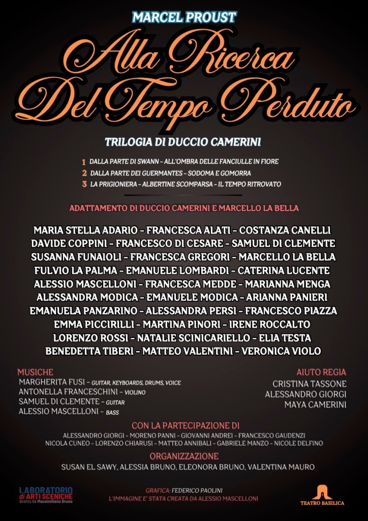 Debutta in prima assoluta dal 18 al 21 luglio al Teatro Basilica di Roma ALLA RICERCA DEL TEMPO PERDUTO di Marcel Proust, con l’adattamento di Duccio Camerini e Marcello La Bella e l’interpretazione degli allievi del Laboratorio di Arti Sceniche diretto da Massimiliano Bruno, di cui Camerini è docente.