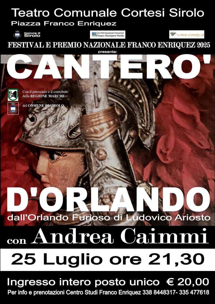 Cuore simbolico e drammaturgico del festival sarà lo spettacolo Canterò d’Orlando, riscrittura scenica del poema cavalleresco ludovicense, firmata da Paolo Larici e interpretata da Andrea Caimmi. L’allestimento andrà in scena venerdì 25 luglio 2025, alle ore 21:30, presso il Teatro Comunale “Cortesi” di Sirolo (AN), all’interno del Festival e Premio Nazionale Franco Enriquez 2025.
