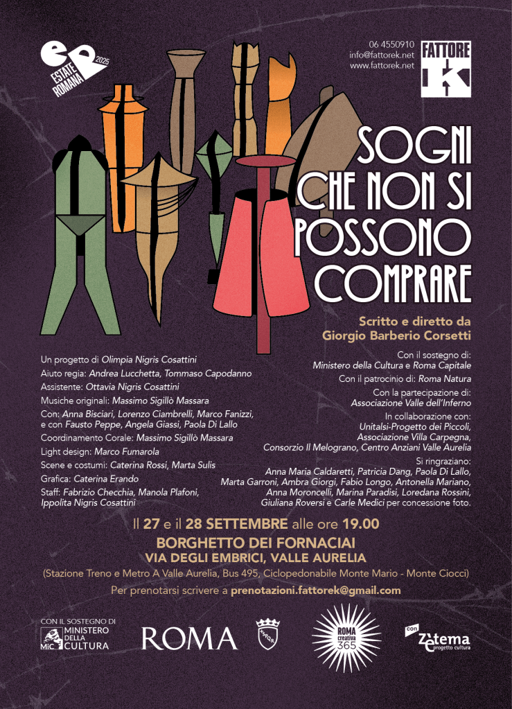 Un borgo storico nel cuore di Valle Aurelia – dimora delle fornaci romane per i laterizi e dei suoi fornaciai – si trasforma in palcoscenico, un parco urbano diventa scenario di poesia e visioni e proprio qui prende vita “Sogni che non si possono comprare”. Il nuovo progetto teatrale scritto e diretto da Giorgio Barberio Corsetti, con le musiche originali di Massimo Sigillò Massara, in scena il 27 e 28 settembre al Borghetto dei Fornaciari.