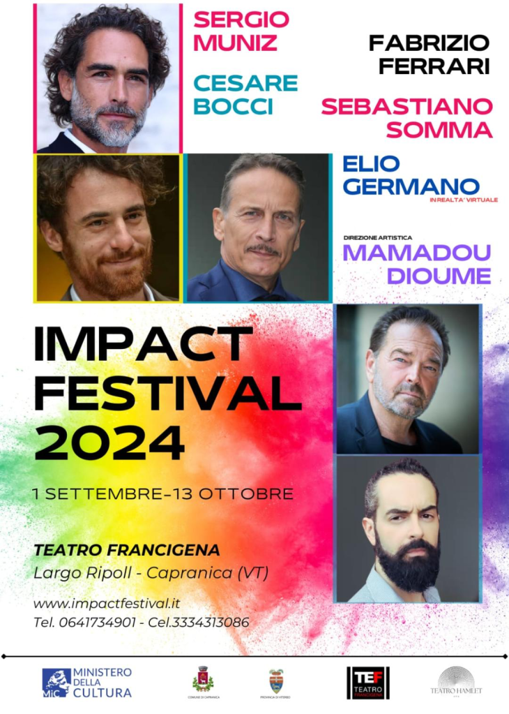 Impact Festival è organizzato dal TEATRO HAMLET APS con il patrocinio e il sostegno del Ministero della Cultura, della Provincia di Viterbo e del Comune di Capranica con la Direzione Artistica del Maestro Mamadou Dioume, attore e collaboratore di Peter Brook.