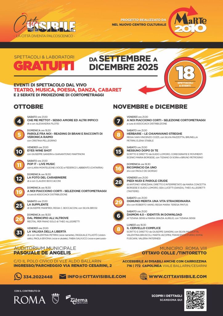 Il progetto Città Visibile, ideato e realizzato da Marte 2010, promosso da Roma Capitale e vincitore dell’Avviso Pubblico per la realizzazione di iniziative di interesse per l’Amministrazione Capitolina in occasione del Giubileo 2025, in collaborazione con Zètema Progetto Cultura, ha preso vita lo scorso 24 settembre per concludersi il 18 dicembre 2025 all’interno del Polo Civico di Viale Aldo Ballarin, nel Municipio VIII.
