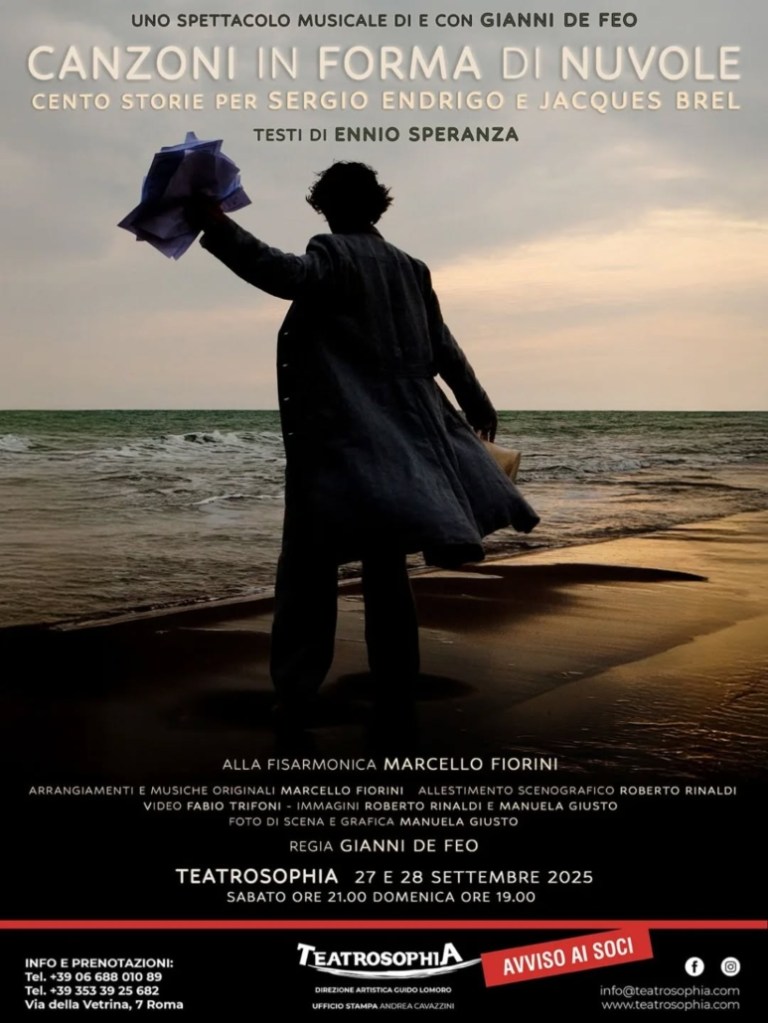 In scena il 27 e 28 settembre uno spettacolo musicale che vede come autore e protagonista un artista che Teatrosophia ama molto: Gianni De Feo. CANZONI IN FORMA DI NUVOLE, Cento Storie per Sergio Endrigo e Jacques Brel.Testo di Ennio Speranza. Alla fisarmonica Marcello Fiorini. Allestimento scenografico e costumi Roberto Rinaldi. Produzione: FLORIAN METATEATRO.