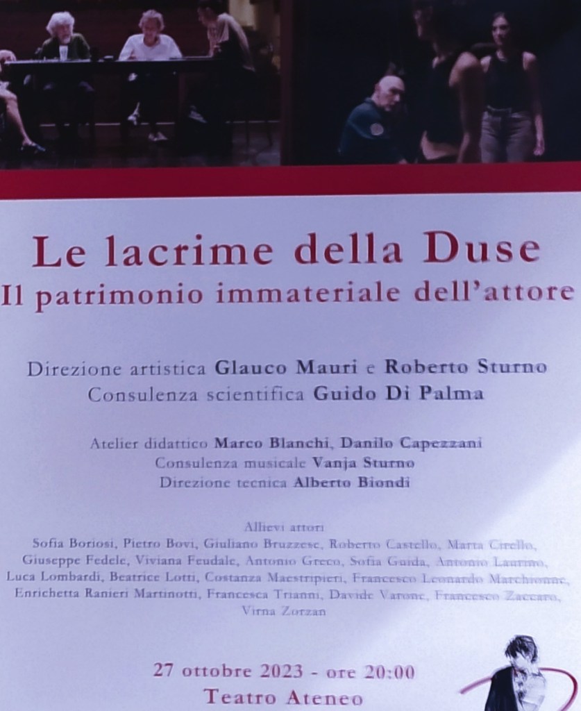 E’ allora in omaggio a questa antica pratica pedagogica che il progetto che ieri sera è approdato alla sua conclusione prende il nome “Le lacrime della Duse. Il patrimonio immateriale dell’attore”. E rappresenta il tentativo di recuperare il sistema di trasmissione del mestiere immateriale dell’attore.