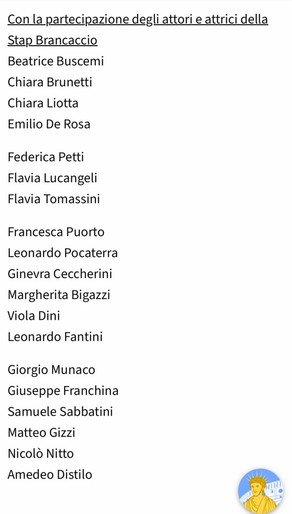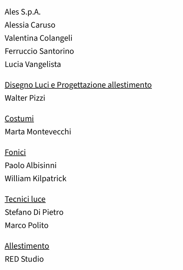 Attraverso il suo sguardo, custode segreto di tanta bellezza, possiamo godere della nuova vita riconsegnata alle Muse: ora tornate a far danzare i loro corpi, le loro mani, le loro voci. Come fantasmi. Grazie alla partecipazione degli Attori e Attrici dello Stap Brancaccio e della Compagnia di Danza e Circo Contemporaneo Claudio e Paolo Ladisa. E grazie agli interventi coreografici eseguiti dalle Danzatrici dell’Accademia Nazionale di Danza.