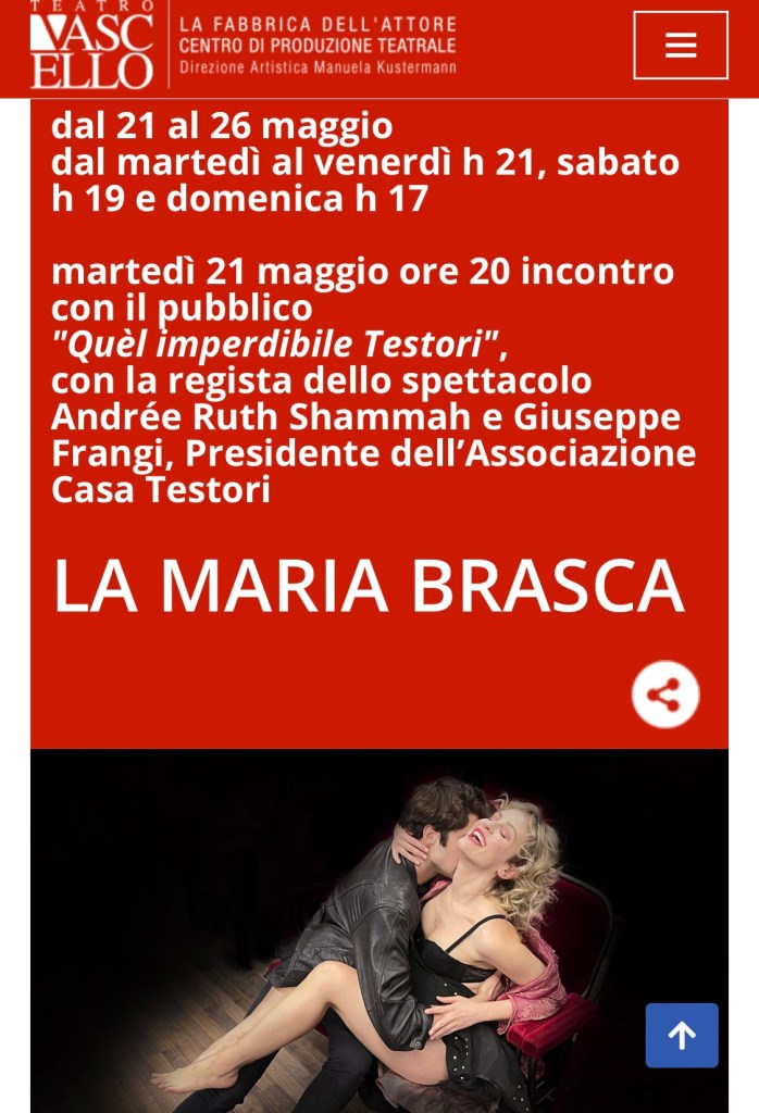 Dopo la proiezione del docufilm “Scarrozzanti e spiritelli – 50anni di vita del Teatro Franco Parenti” alla Festa del Cinema di Roma 2023 e la messa in scena qui a Roma di una selezione di spettacoli prodotti dal Teatro Franco Parenti per condividere con la Capitale i festeggiamenti dell’evento (“Il delitto di via dell’Orsina” di Eugène Labiche per la regia di Andrée Ruth Shammah; “Farà giorno” di Rosa A. Menduni e Roberto De Giorgi per la regia di Piero Maccarinelli e “Sulla morte senza esagerare” per la regia di Riccardo Pippa) con “La Maria Brasca” di Giovanni Testori – regia di Andrée Ruth Shammah – si chiude il ciclo di spettacoli selezionati dalla Shammah per onorare i festeggiamenti, qui a Roma, dei 50anni di vita del Teatro Franco Parenti, nonché del centenario di Giovanni Testori.