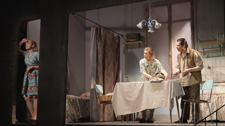 Lei, la Brasca, la sua bocca la tiene ben aperta, anzi la spalanca in seducenti risate di piacere, scandalosamente generose a donare e a ricevere baci. Sua sorella Enrica (un’efficacissima Mariella Valentini) invece è sovrastata dall’affettuosa premura a mantenere un’apparenza di decoro nella sua famiglia. Nonostante correnti telluriche scuotano il sottosuolo della sua esistenza e quella dei suoi familiari: quella di suo marito Angelo (un delizioso Luca Sandri, così placido proprio perché così inquieto) e quello di sua sorella Maria, che ha perso la testa per quel fannullone del Camisasca (un Filippo Lai che splende di quel groviglio di prorompente impulsiva immaturità, proprio del suo personaggio). Atteggiamento che, per l’ottimismo della Brasca, proprio perché così vago nel decidersi a trovare focalizzazione su un lavoro, é espressione del fatto che può farli tutti. Mica come suo cognato, l’ Angelo, che “non era difficile capire che più che meccanico non sarebbe mai diventato!“.