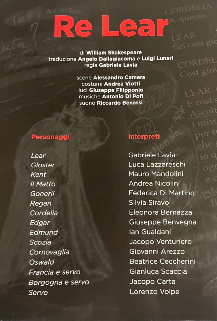 E’ quello che vediamo rappresentato in Cordelia, in Edgard ma anche in Kent, autentico servitore e amico di Lear. Persone che nella loro giovane esistenza hanno colto la precarietà della natura umana così come il valore miracoloso della compassione e del perdono. Con questa consapevolezza, riescono a vivere il potere come un incarico: una responsabilità che grava e che non va scambiata con un punto di arrivo. Né con una presunzione di eternità. Piuttosto un’eredità da sostenere con gratitudine e creatività morale: imparando a rinunciare – o riuscendo a far buon uso – del superfluo.