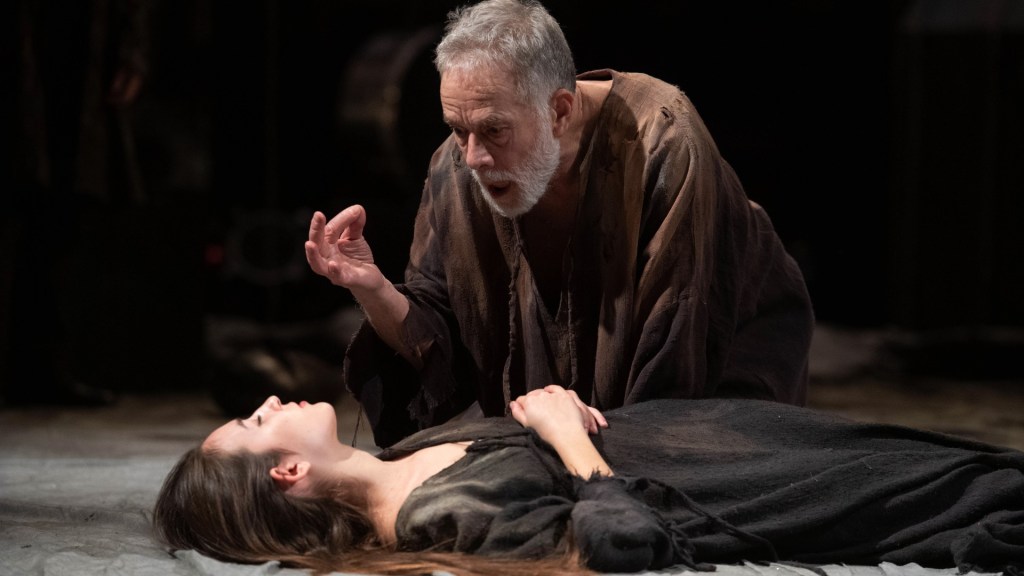 Così com’é di struggente bellezza “sacra” la scena del desiderio suicidario di Gloucester, intuito dal figlio Tom che, in un amorevole inganno, ricerca e trova l’altezza della sedia che può tollerare l’idea della messa in scena (terapeutica) di un suicidio apparente. E’ quel sano concetto del “correggere l’altro” che nasce per un suo bene. E non per il proprio: pretesa che invece celava l’invito al correggersi di Lear a Cordelia, di fronte all’ambiguo tentativo della figlia di esprimere a parole ciò che invece si dà nella sua autenticità solo nei gesti. L’amore.