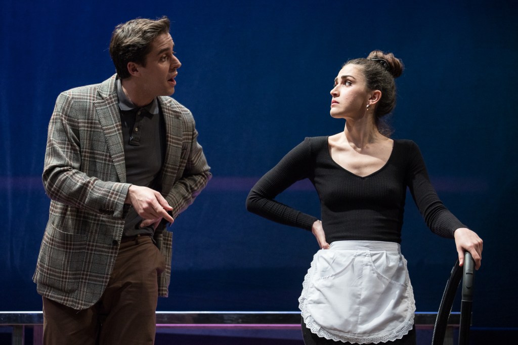 Ecco allora che anche sulla scena, vira alla subdola tonalità del verde-stagno la luce ( il cui disegno è curato da Javier Delle Monache) sulla maxi parete del fondo, la cui “fluidità” spaventa – quasi fosse la tela bianca di un artista – tante le possibilità che potrebbe ospitare. E si arriva così a scoprire che quella parete che “sembrava” avere la solidità di un muro capace di ospitare un maxi-televisore led si rivela in tutta l’impalpabilità di un velo. E mette a nudo la curiosità e il piacere voyeristico di chi abita al piano di sopra, proprio come fossero dietro ad uno schermo digitale.