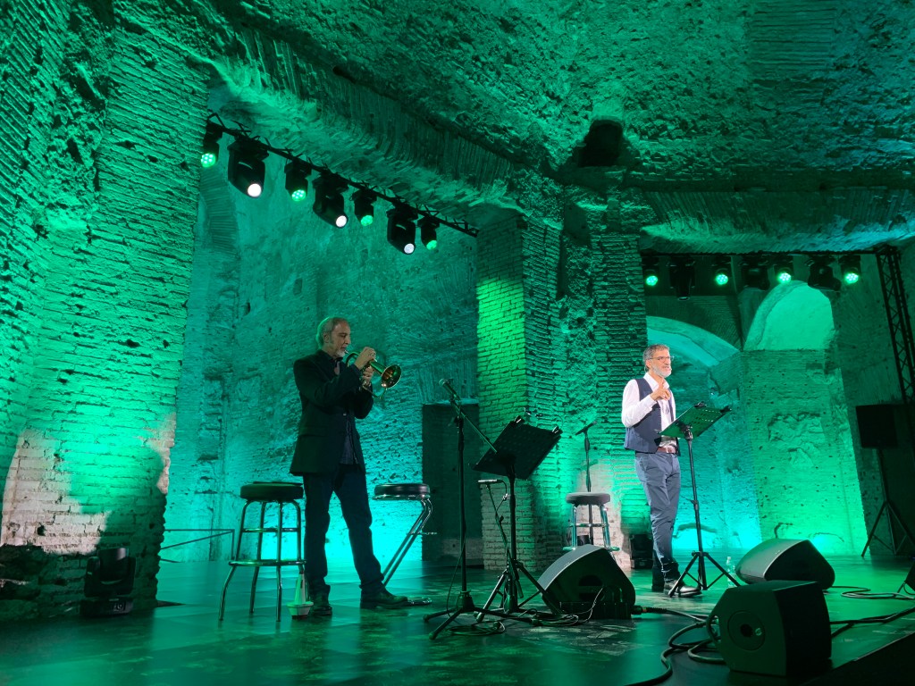 E così, con la complicità di Fabio Stassi e di Franco Piana, ha trovato espressione ieri sera il canto della Musa Euterpe “ …che dona a coloro che l’ascoltano cantare letizia…” (Diodoro Siculo, Biblioteca Storica IV, 7.3). Un canto che è una carezza che, insieme, ci libera e ci unisce. Lì, negli insoliti vani del complesso della Sala Ottagonale, straordinaria macchina scenica creata dagli architetti Severo e Celere per rispondere al progetto visionario di Nerone.