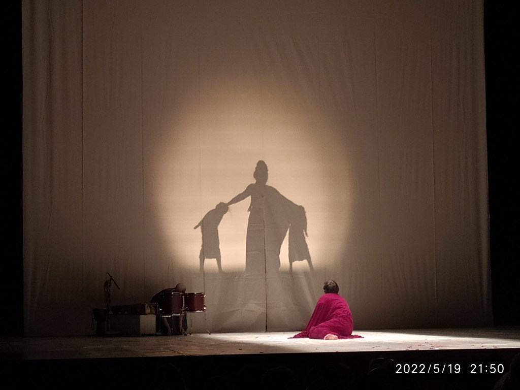Condotti in uno dei locali predisposti per la rappresentazione, siamo stati fatti accomodare su cuscini a terra o su piccoli sgabelli disposti a semicerchio che facevano da contorno alla scena. Lì già stavano gli attori: sorpresi a terra da qualcosa che li aveva immobilizzati. Scalzi, tutti, e cinti in vita da una lunga e ampia gonna nera. Sono perfettamente armonizzati con i colori del nudo spazio che li ospita: il nero del fondale e delle porte e il colore della chiara “terra” del palco, delle pareti e della loro pelle.