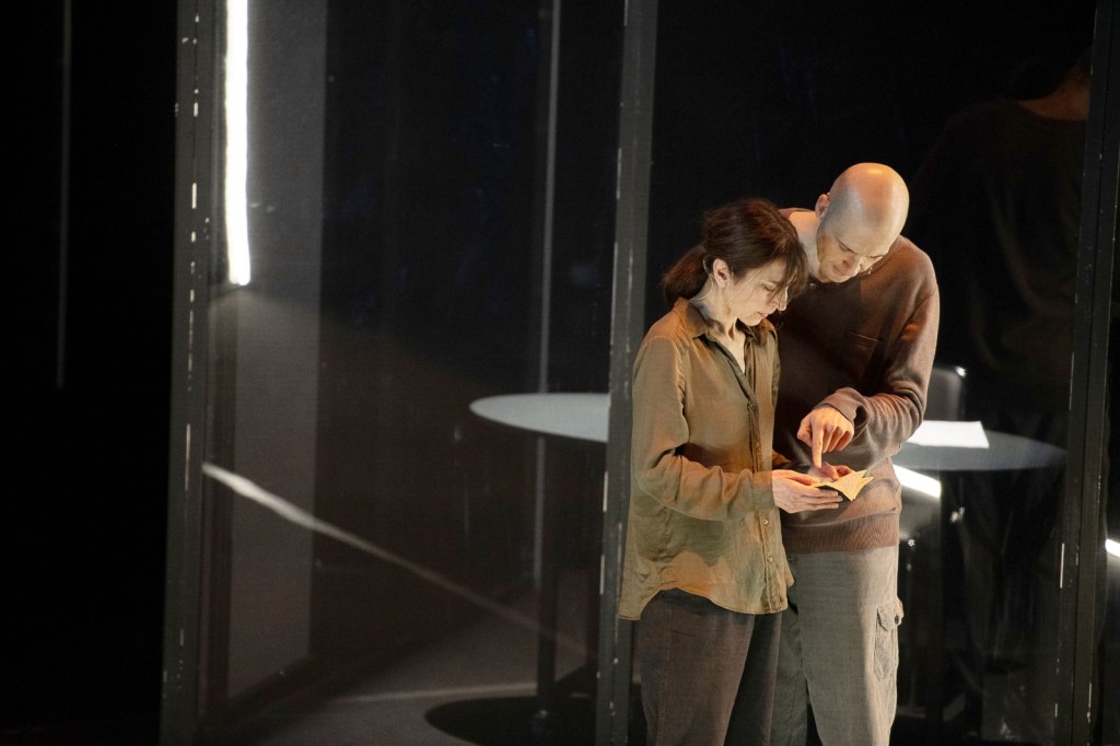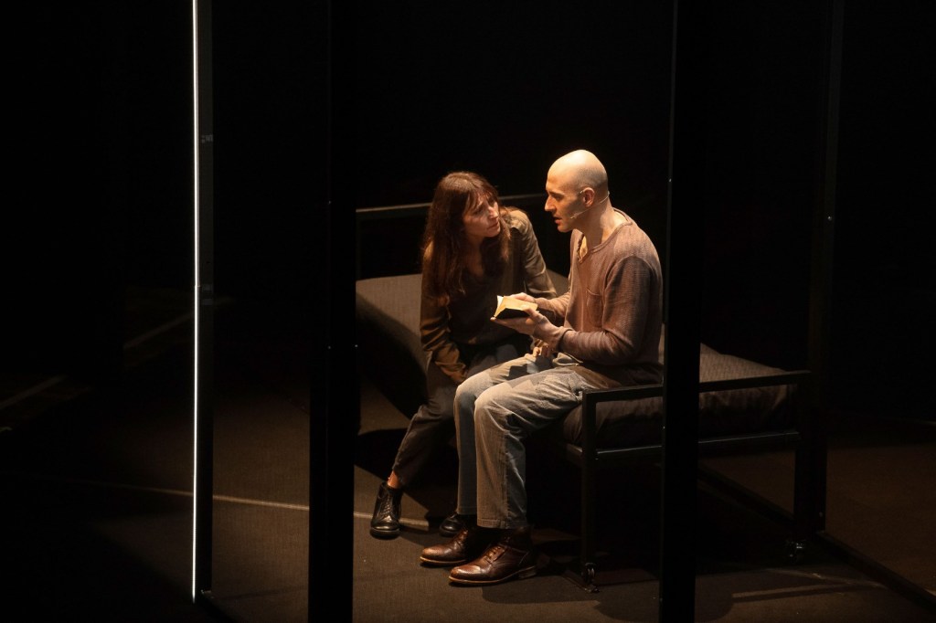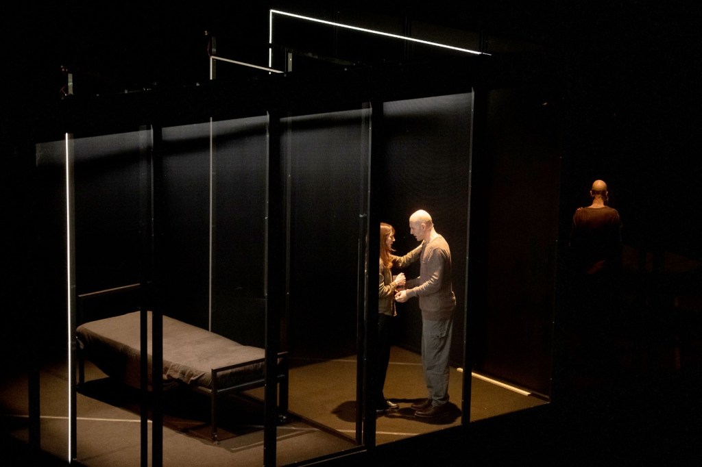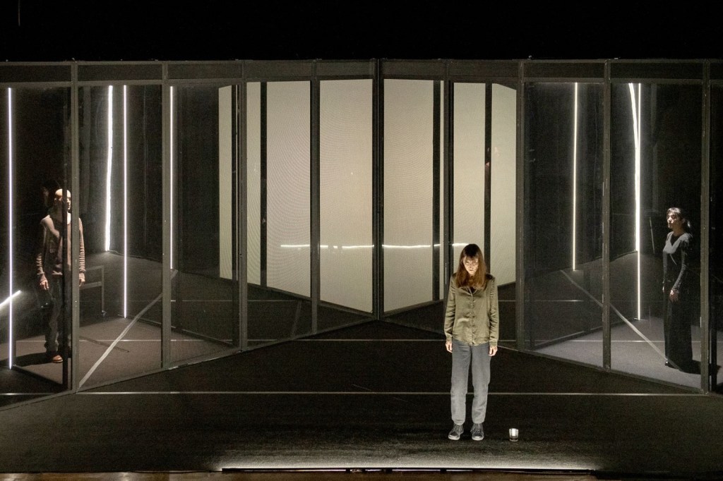 La potente bellezza della scenografia – pensata con acuta visionarietà da Jacopo Gassmann, realizzata con maestria da Gregorio Zurla, scolpita con un sapiente uso delle ombre da Gianni Staropoli, moltiplicata e allucinata dalle proiezioni di Lorenzo Letizia e immersa in un’elettrica suspence sonora da Giorgia Mascia – ce ne parla fin da subito: oscure strutture specchianti sono montate creando apparentemente un punto di fuga: una soluzione. Ma non è quello che sembra. E la possibilità di fuga si rivelerà un modo per stringere all’angolo la coppia protagonista della storia. E predarla.