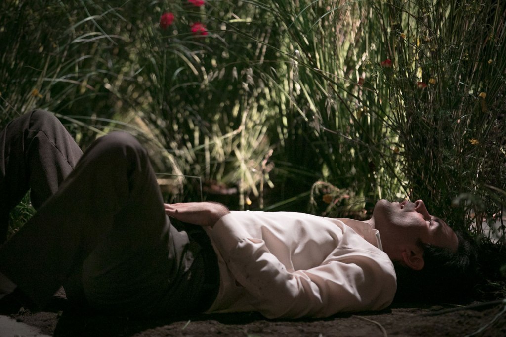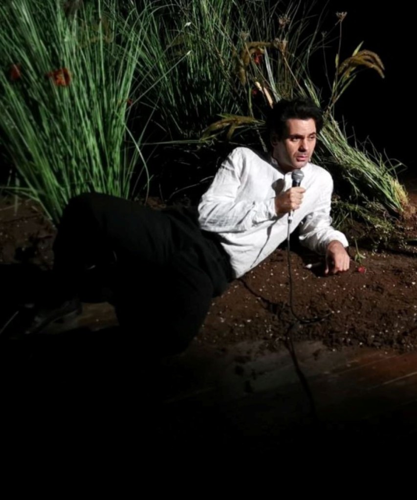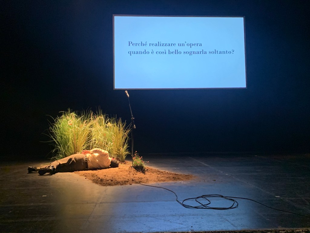 E infatti dentro un utero di terra, sulla cui sommità spuntano lunghi ciuffi d’erba profumata, si rotola beato il feto di Pier Paolo Pasolini (reso con santa e realistica plasticità da Gabriele Portoghese).