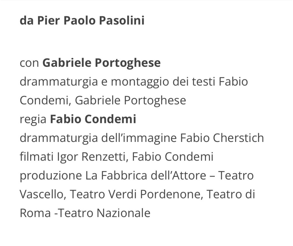 La narrazione poetica ricostruita da Fabio Condemi é carica di quella quotidiana ignara bellezza che sola può esprimere il sacro della realtà. E procede attraversando una selezione di sceneggiature del corpus pasoliniano – necessarie allegorie per la comprensione della realtà – capace di regalare vita ad un’insolita ed affascinante “biografia poetica” sul poeta friulano.