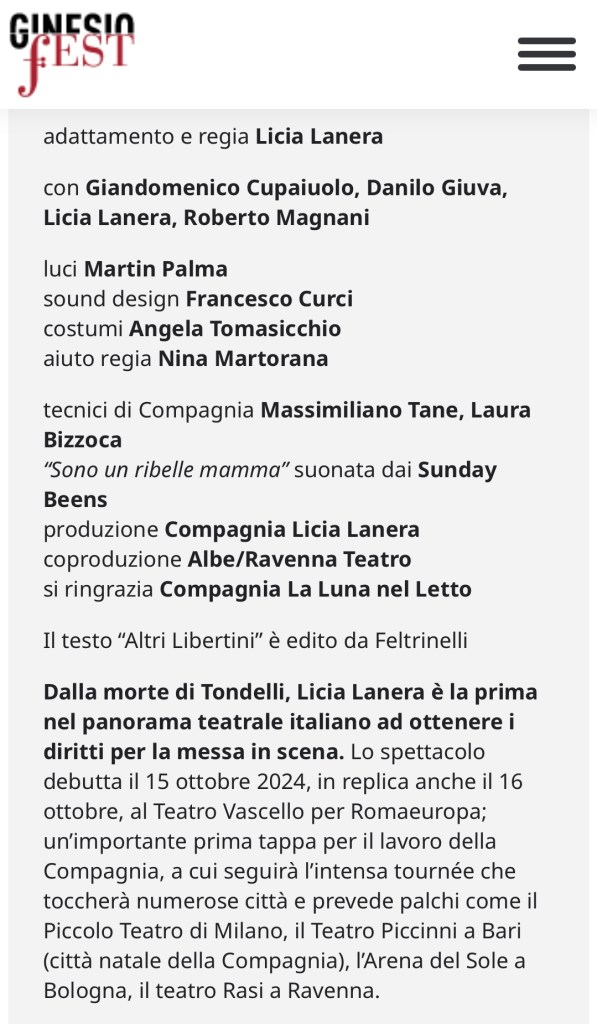 Inclinazioni vitali ben dosate in questo lavoro di Licia Lanera – che la vede attrice e regista – dove nella narrazione musicalmente postmoderna di Tondelli lei si specchia: per parlare di sè. Un raccontare e un raccontarsi, il suo, che trova e include le vite dei suoi compagni di viaggio: Giandomenico Cupaiuolo, Danilo Giuva, Roberto Magnani.