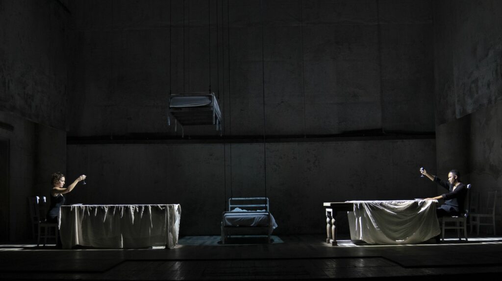 Una mirabile regia di Roberto Andò riesce a declinare efficacemente il movimento di questa dialogica danza esistenziale, proprio della sarabanda, anche attraverso una straordinaria costruzione dello spazio teatrale. E, nell’immaginarla, si avvale della complicità raffinatamente rigorosa di Gianni Carluccio, che ne cura le scene e il disegno luce.