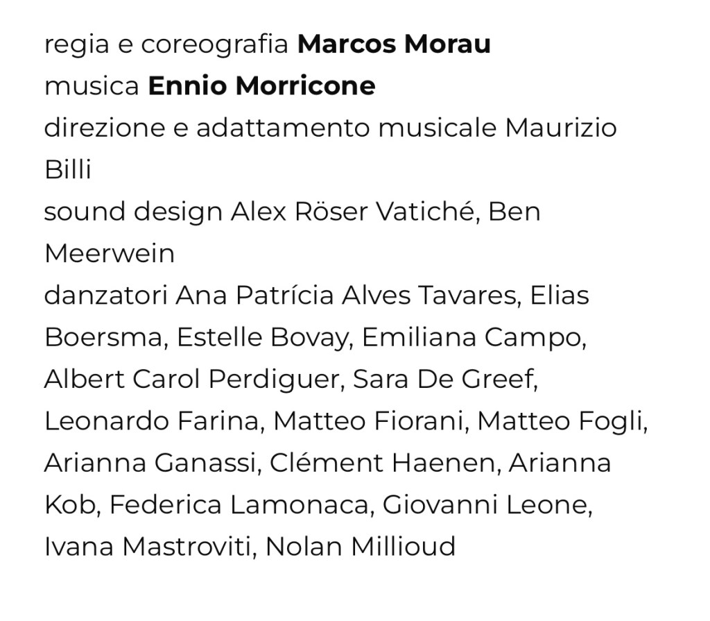 ori a fine spettacolo. Motivi che nello spettacolo si intrecciano al sound design elettronico di Alex Roser Vatiché e Ben Meerwein , a stralci di discorsi di Morricone fino alle parole dal vivo dette dai danzatori.