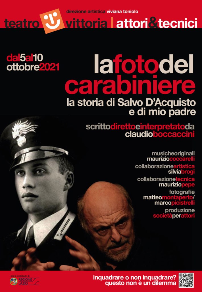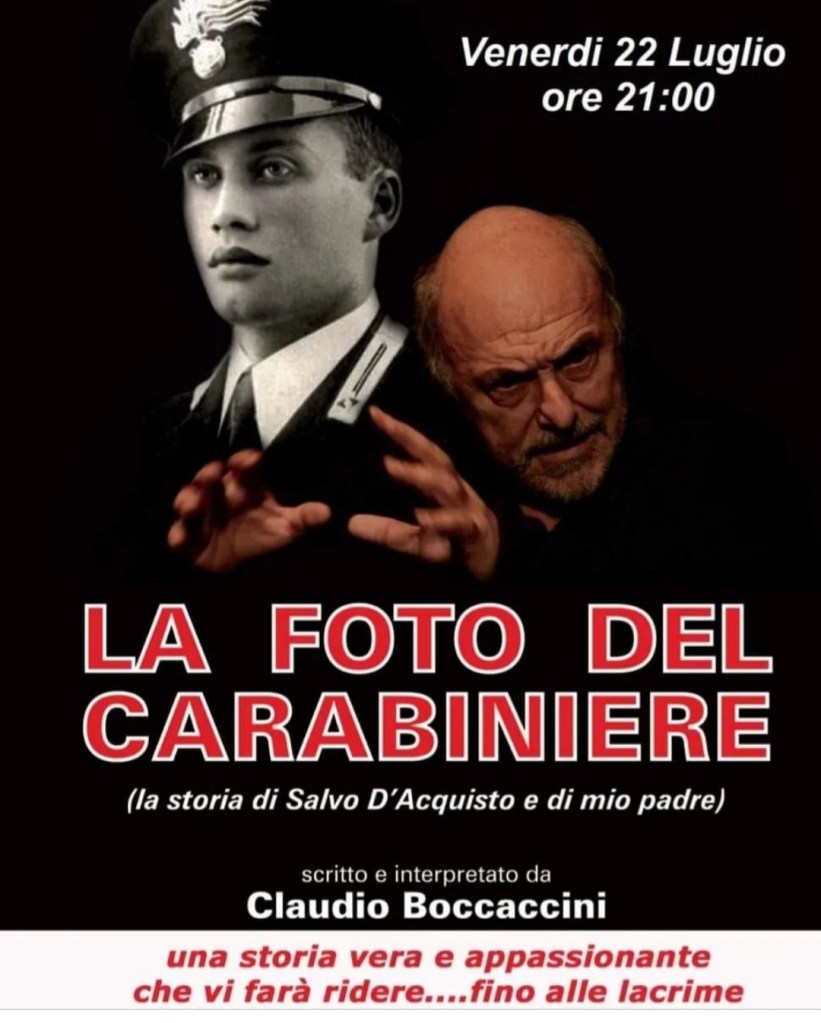 Dicono che la vita sia “riuscire a fare qualcosa degli incontri che ci hanno fatto”. E l’intenzione che è alla base di questo affascinante spettacolo sembrerebbe essere proprio questa: “un giorno si nasce, un giorno si muore, un giorno si cresce”. All’età di sette anni Claudio Boccaccini “incontra” per la prima volta, senza saperlo, il vice brigadiere dell’Arma dei Carabinieri Salvo D’Acquisto: un giovane la cui foto era sfuggita dalla patente di suo padre, dove era custodita. Ma quello era al tempo (siamo nel 1960) il posto d’onore per i familiari, soprattutto per i figli. E dunque chi sarà mai costui ?